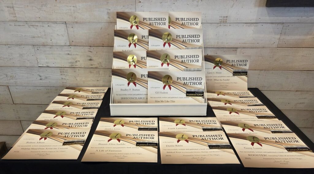 Inaugural Published Authors Celebration 01 Writers League President Jeanne Rogers (right) and Event speaker Jenny Hale on October 14, 2025 02 Published Authors Certificates Awarded 04 Event Chair Gil Hudson and his niece, Jenny Hale, author/publisher and Guest Speaker 05 JT Wilcox, reporter from the Daily Sun, and Writers League past president Frank Lancione